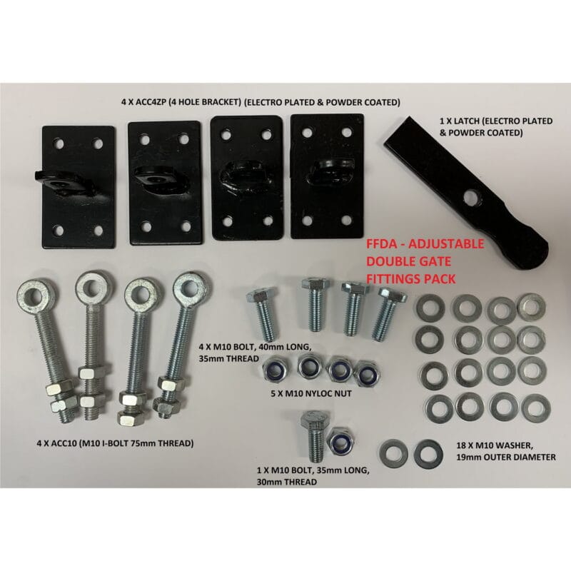 Fittings included; Hinge angle brackets, bolts, rocker latch and 2 drop bolts. (No screws or wall plugs included) Nuts and bolts must be painted after fitting to prevent the onset of rust.