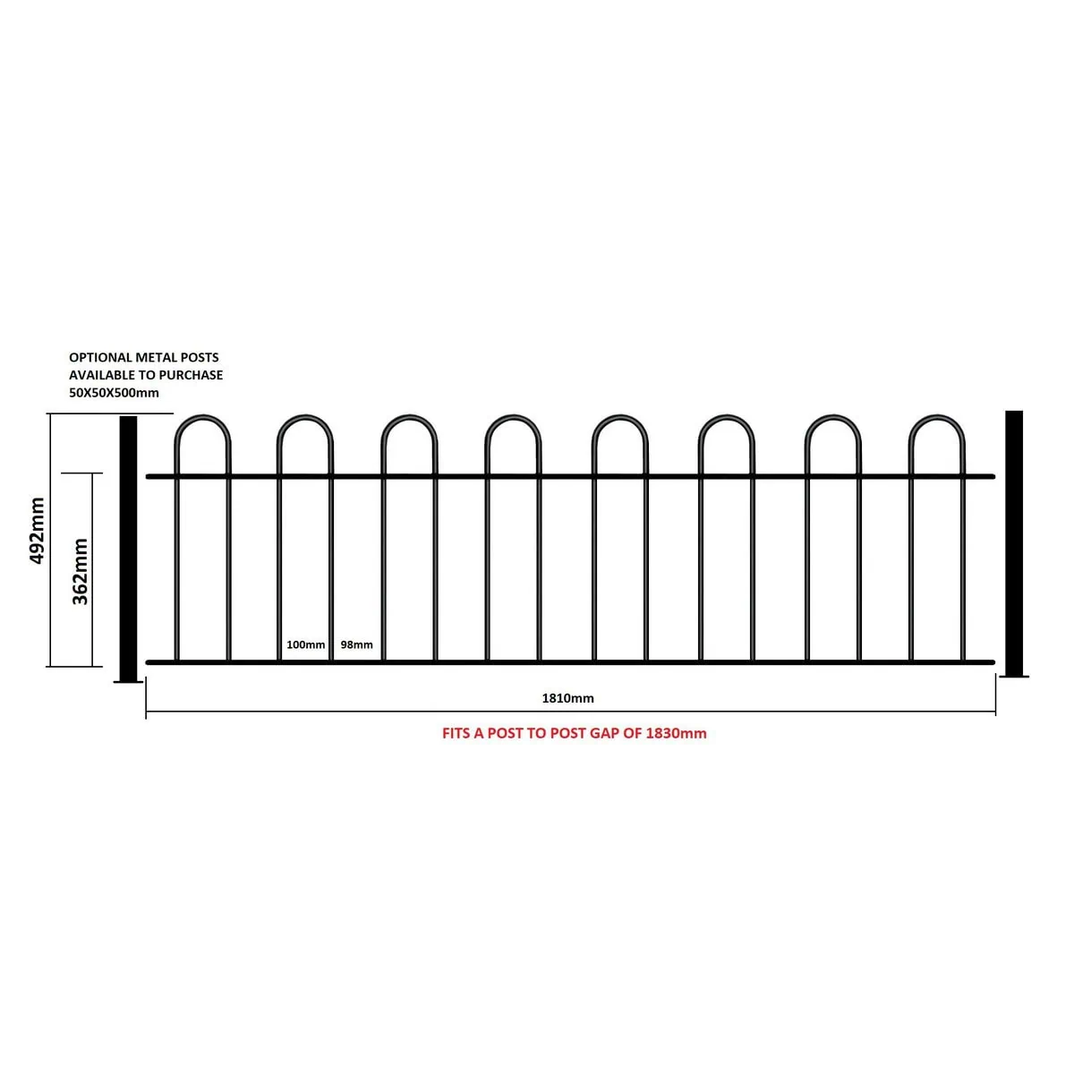 Hoop top metal railing panel fits a total post to post GAP of 1830mm (6ft). Frame height is 362mm and overall height to top of hoop is 490mm. We already account for the hinge gaps within the width measurement listed.