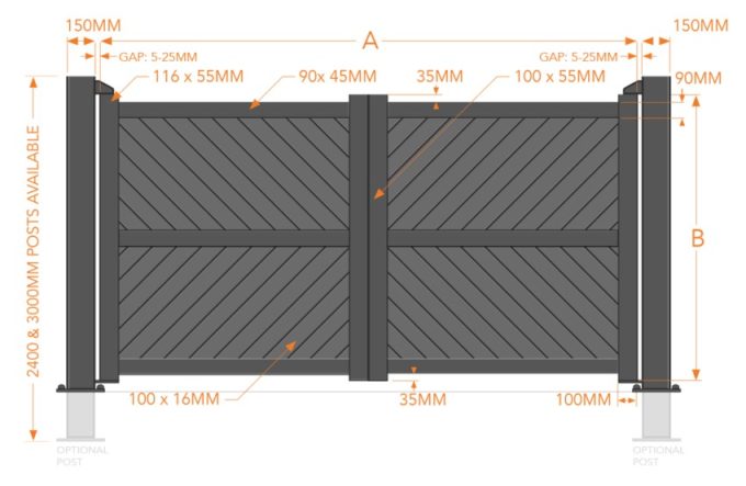The RMG003DG is a full privacy driveway gate with a diagonal solid infill and flat top, providing a modern and streamlined design.