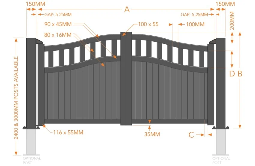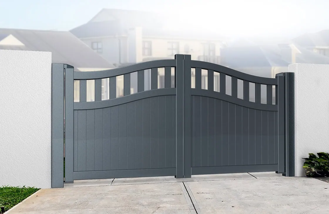 The RMG005DG is a partial privacy driveway gate with a vertical solid infill and bell-curved top, providing a traditional, unique style with a contemporary twist while allowing more visibility on the top section of the gate.