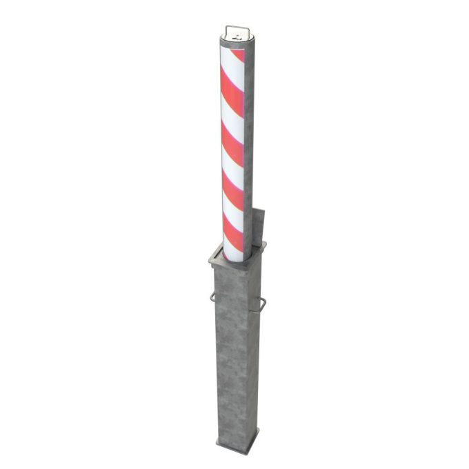 Heavy duty round mild steel telescopic security post, 90mm diameter, 7mm wall thickness, 670mm above ground, 10 pin high security integral lock, keyed alike or to differ. Galvanized finish.