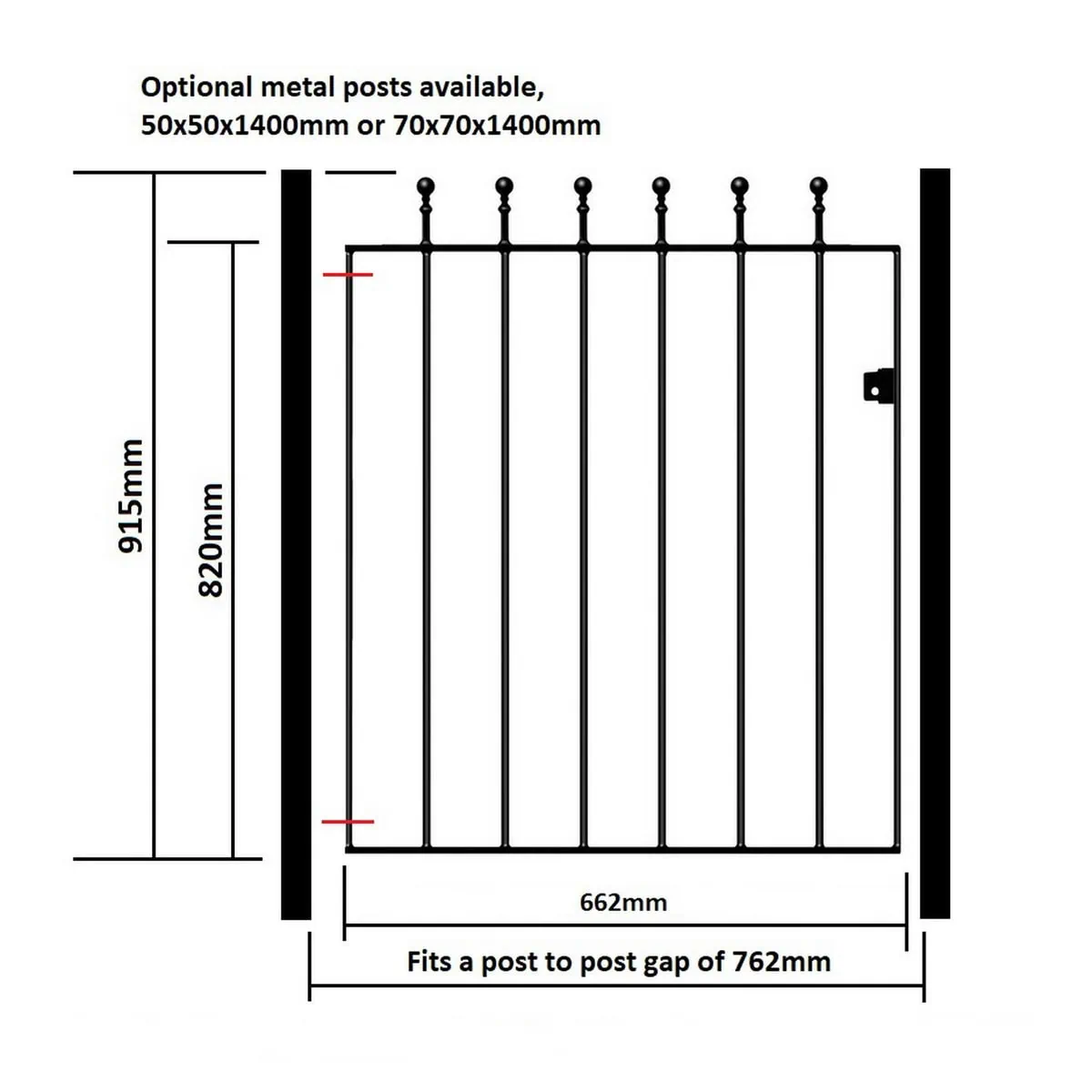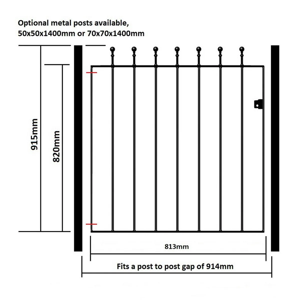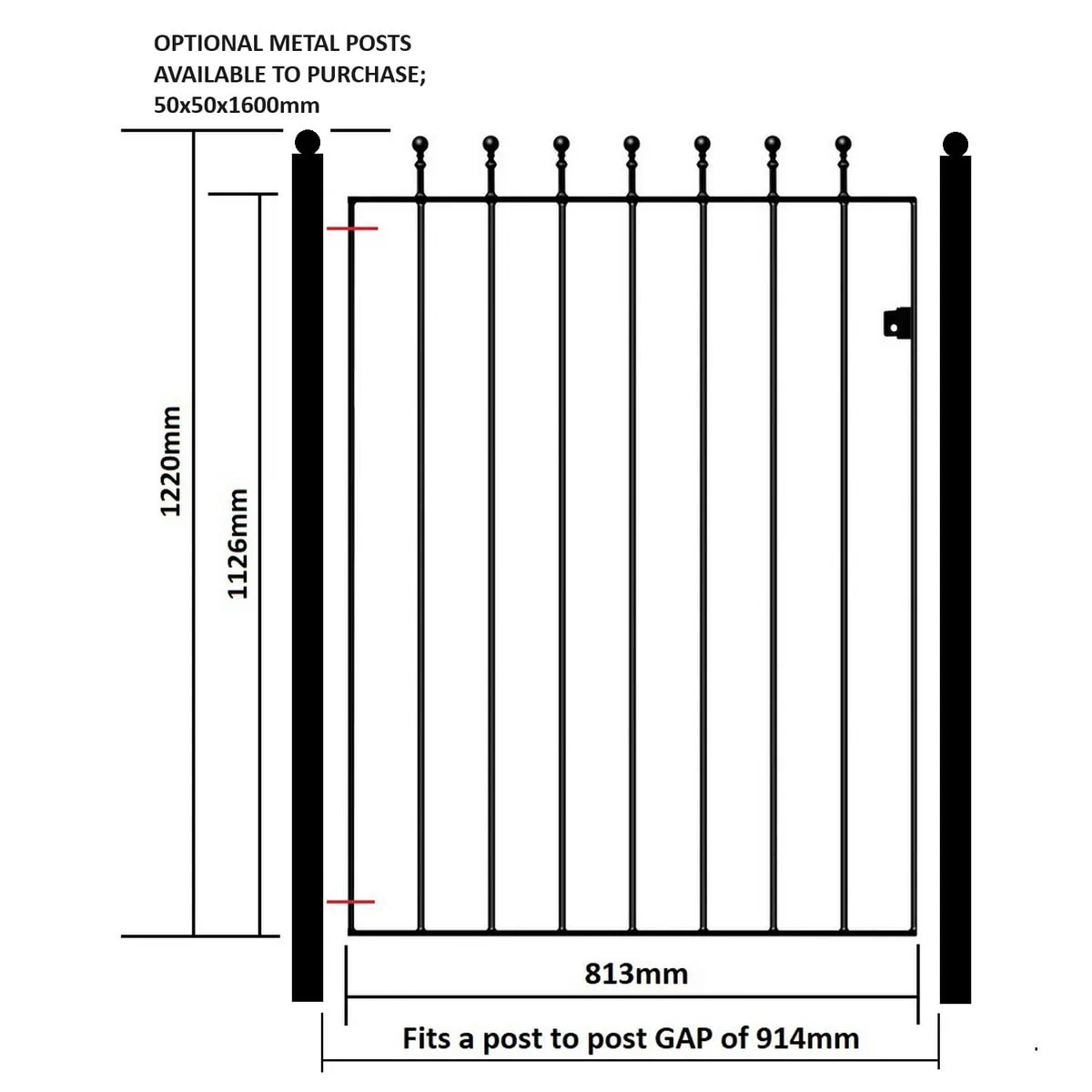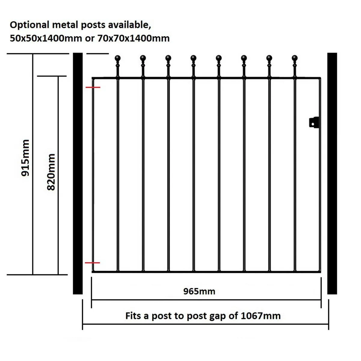 Ball top metal garden gate fits a total post to post GAP as stated in the size selection. MAZP05/** Gate frame height is 820mm and 915mm to top of ball finial. MAZP06/3 Gate frame height is 1126mm and 1220mm to top of ball finial. We already account for the hinge and latch gaps within the width measurement listed.