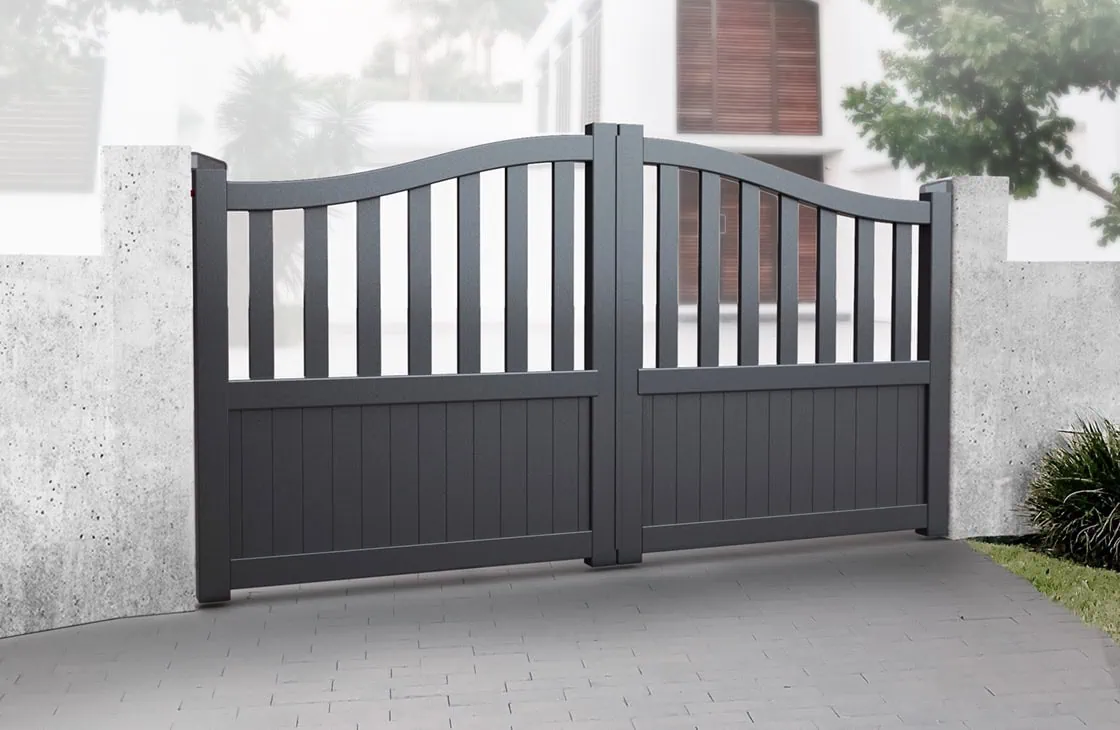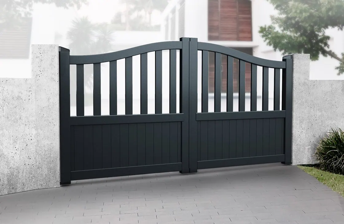 Partial Privacy Double Swing Gate – Solid vertical infill bell-curved top