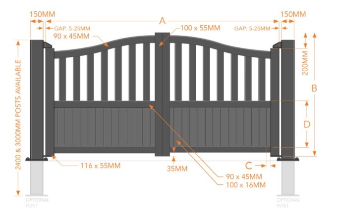 The RMG007DG is a partial privacy driveway gate with a vertical solid infill and bell-curved top, providing a traditional, unique style with a contemporary twist while allowing more visibility on the top section of the gate.