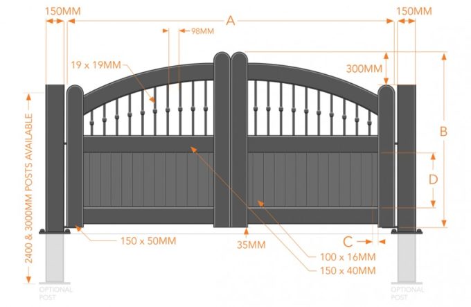 The RMG009DG is a partial privacy driveway gate with a vertical solid infill, bell-curved top and a wider structural frame for a more robust, executive style, allowing visibility to the middle section of the gate.