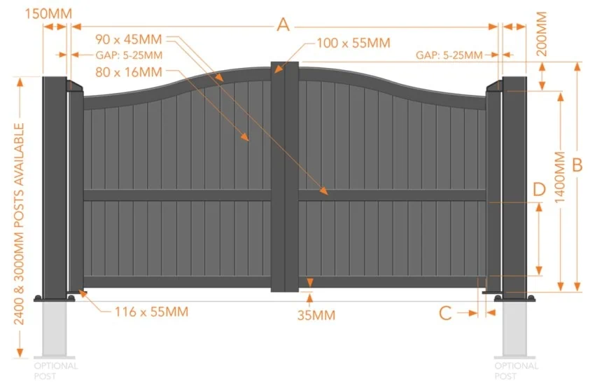 Partial Privacy Double Swing Gate – Solid vertical infill bell-curved top