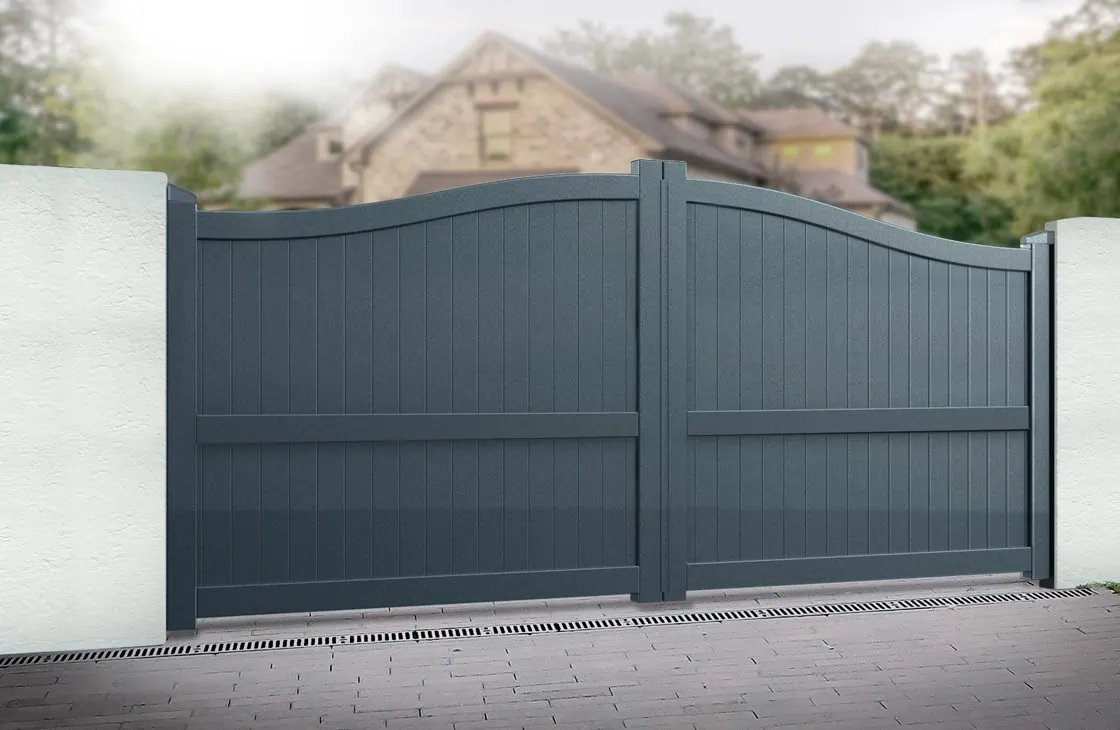The RMG004DG is a full privacy driveway gate with a vertical solid infill and bell-curved top, providing a modern and streamlined design.