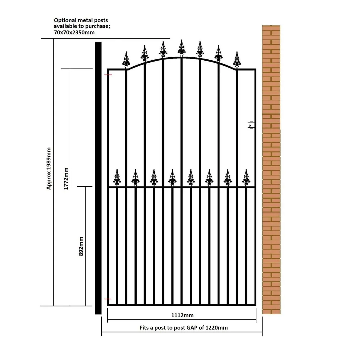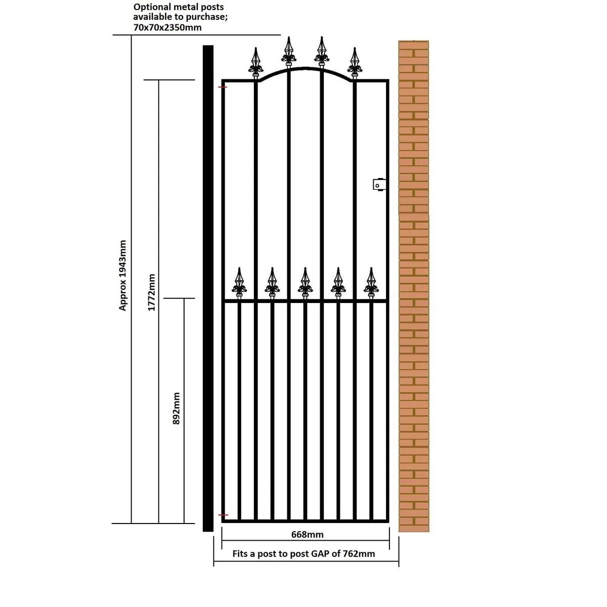 The tall metal garden gate fits a total post to post GAP as stated in the size selection. Gate side frame shoulder height is 1772mm rising to 1970mm to top of spear finial in the centre. We already account for the hinge and latch gaps within the width measurement listed.